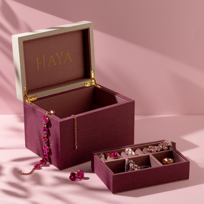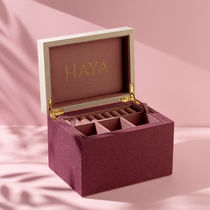 ملبّس قماش فاخر بلون عنابي مع لمسات وردي غامق وبيج، مع خيار طباعة الاسم