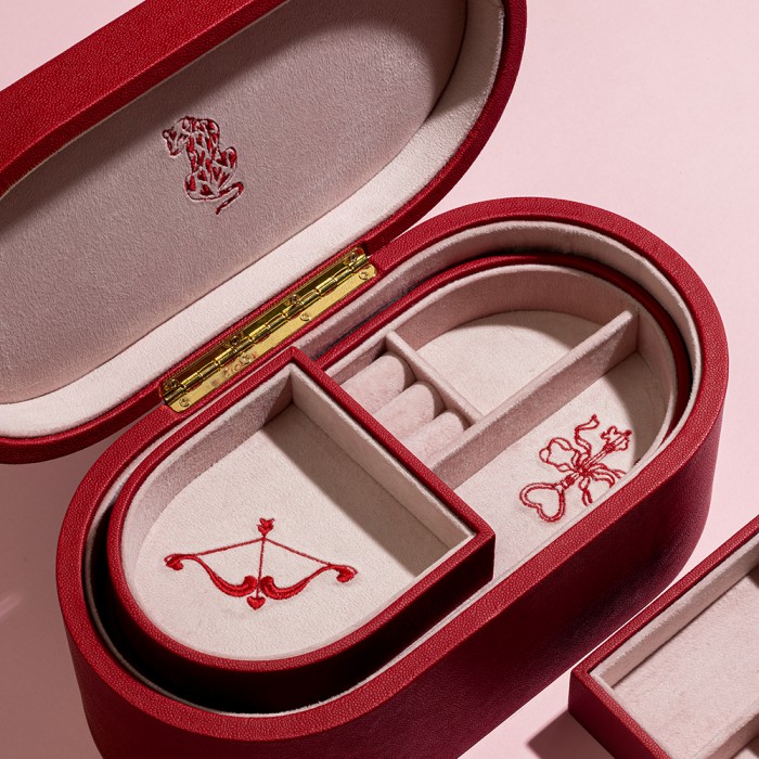 • جلد أحمر فاخر، من الداخل وردي مطرّز، يتزيّن بحرف العميل من اللؤلؤ