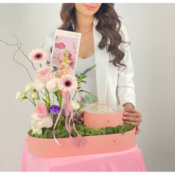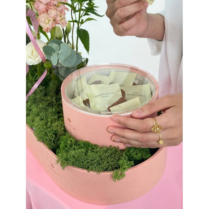 صينية جلدية أنيقة باللون الوردي، مزينة بتنسيق ورد بينك ناعم وبوكس جلد داخله شوكولاتة فاخرة. تصميمها يجمع بين الرقة والفخامة والحلاوة، لتكون هدية مميزة تنبض بالأنوثة والفرح في كل تفاصيلها