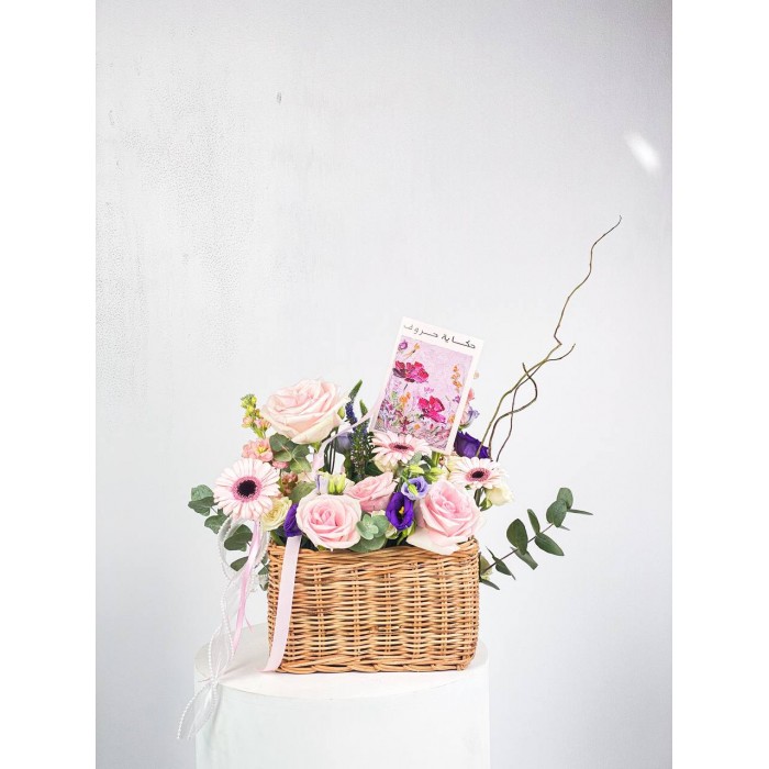 تنسيق وردي ناعم من الجربيرا والروز، يحتضن أنوثة اللون بين طيات سلة خوص دافئة. تفاصيلها تهمس بالهدوء والجمال، وتمنح المكان لمسة راقية تنبض بالحب والصفاء