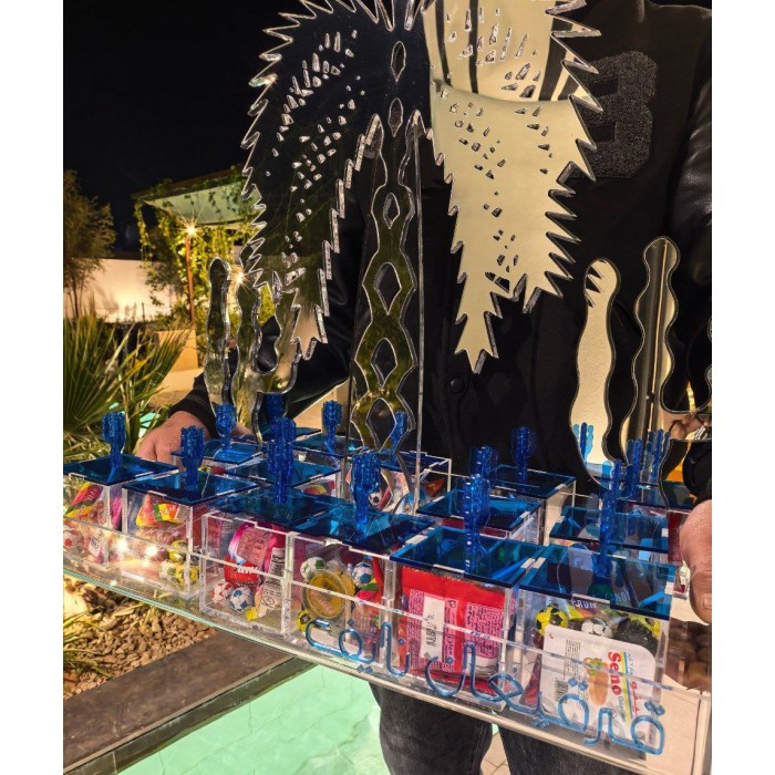 صينية قرقيعان بتصميم عصري وراقي، مصنوعة من الأكريلك الشفاف، تتوسطها نخلة أكريلك شفافة مع لمسة أكريلك مرايا تضيف انعكاس فخم، ومزينة بـ صبارات أكريلك يمين ويسار النخلة