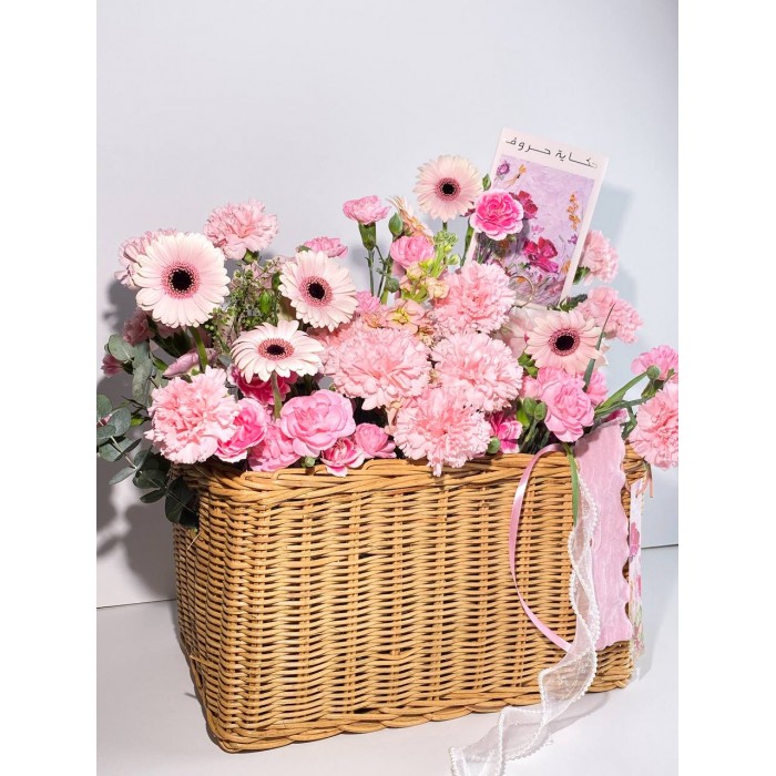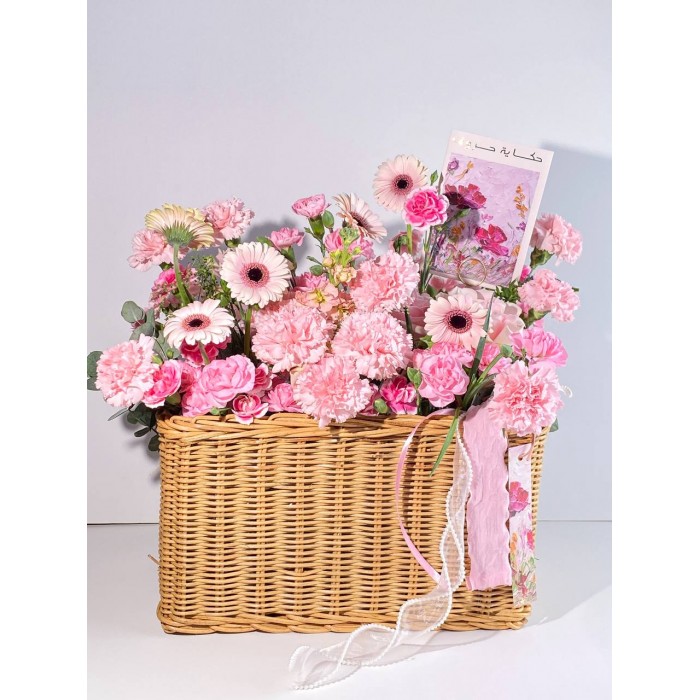سلة تجمع الجربيرا والقرنفل الوردي بتناغم ناعم يعبّر عن رقة وأنوثة ولمسة فاخرة من الجمال