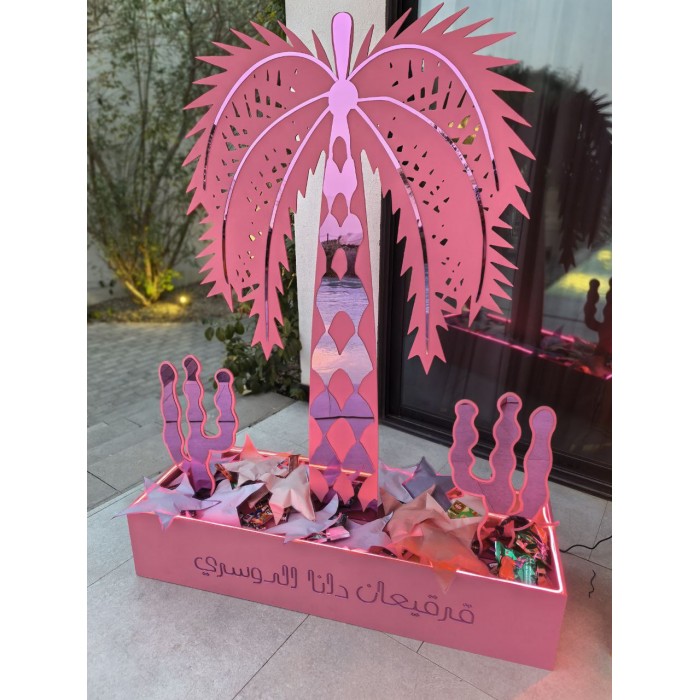 مجسم نخلة فخم بتصميم تراثي مع لمسة عصرية، نخلة كبيرة بارتفاع : مصنوعة من الخشب والأكريلك، مثبتة داخل حوض خشبي أنيق يحتوي على إضاءة LED تعطي أجواء دافئة وجذابة.