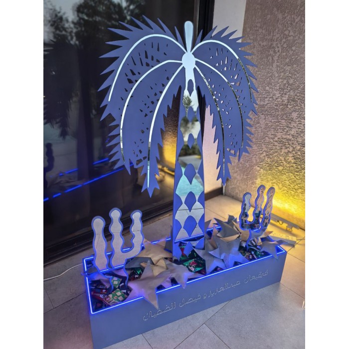 مجسم نخلة فخم بتصميم تراثي مع لمسة عصرية، نخلة كبيرة بارتفاع : مصنوعة من الخشب والأكريلك، مثبتة داخل حوض خشبي أنيق يحتوي على إضاءة LED تعطي أجواء دافئة وجذابة.